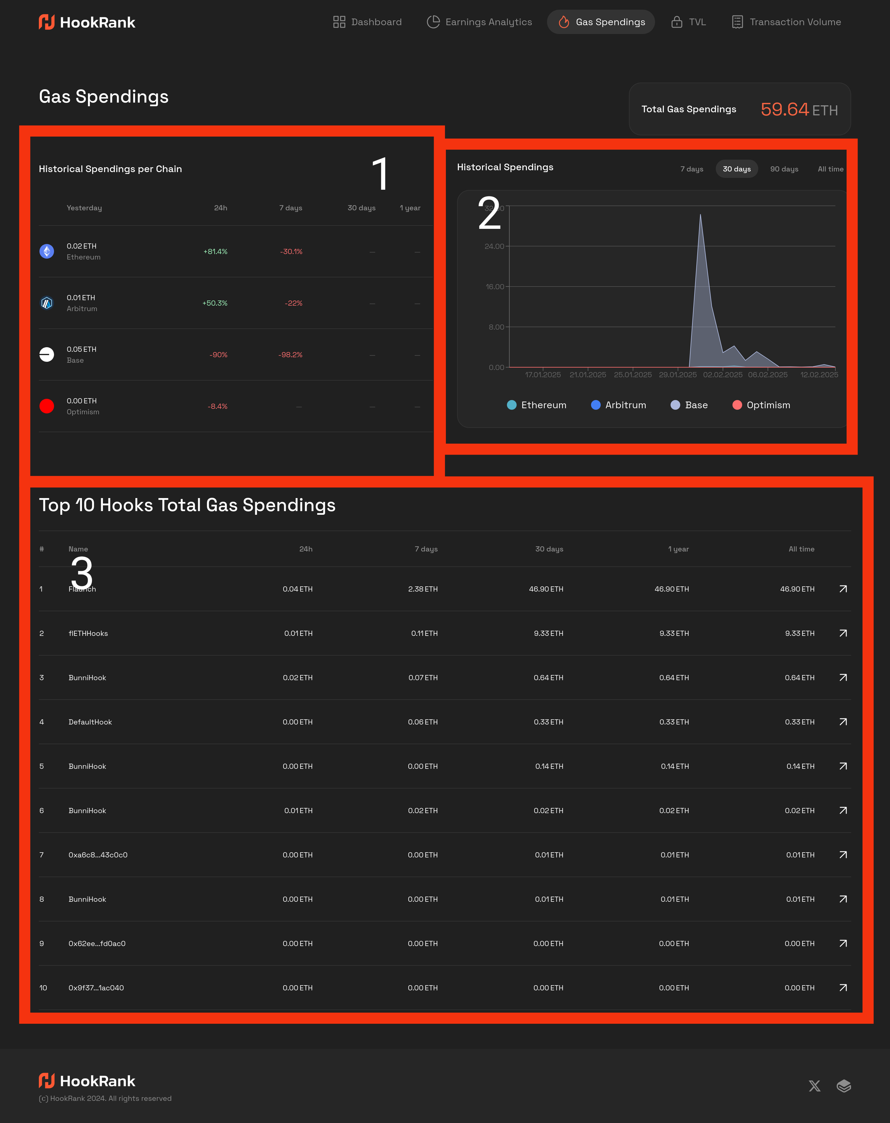 Gas Spendings in HookRank delivers an in-depth analysis of the gas fees associated with hooks across multiple chains. This feature allows developers and users to monitor and evaluate the gas costs incurred by their hooks, providing a clear view of expenses related to transaction execution.
